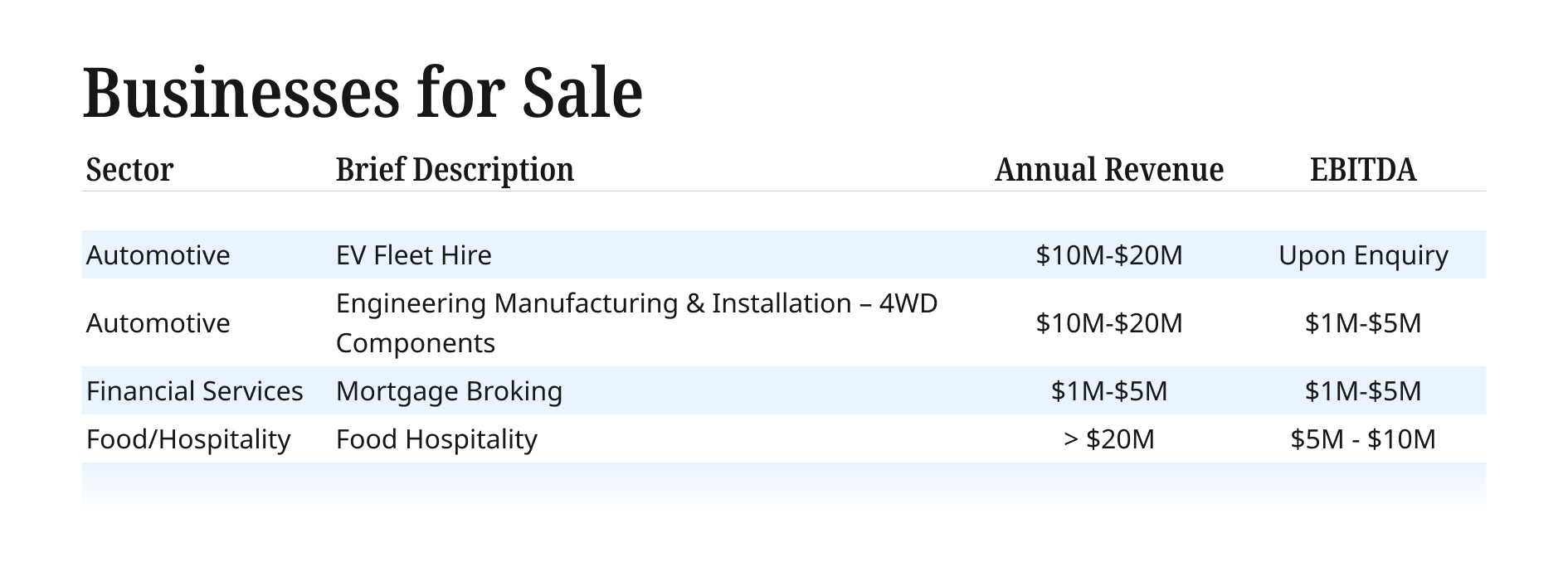 BlueRock's Deal Sheet features a curated list of businesses available for sale around Australia. We create this list for parties actively seeking to acquire or invest in businesses, and those on the sell side.
